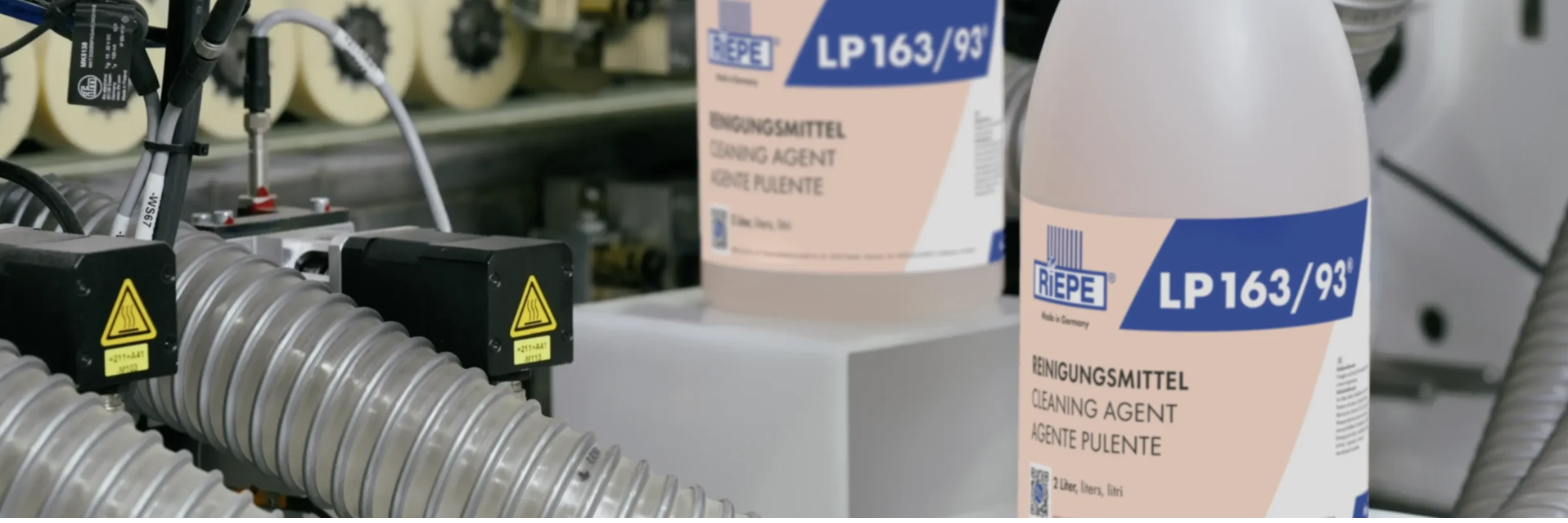 Riepe cleaning fluids are specially formulated to prevent glue residue, streaking, and static build-up during the edgebanding process. Applied through the Riepe spray system, these fluids ensure clean, polished edges and surfaces while extending the lifespan of machine components.